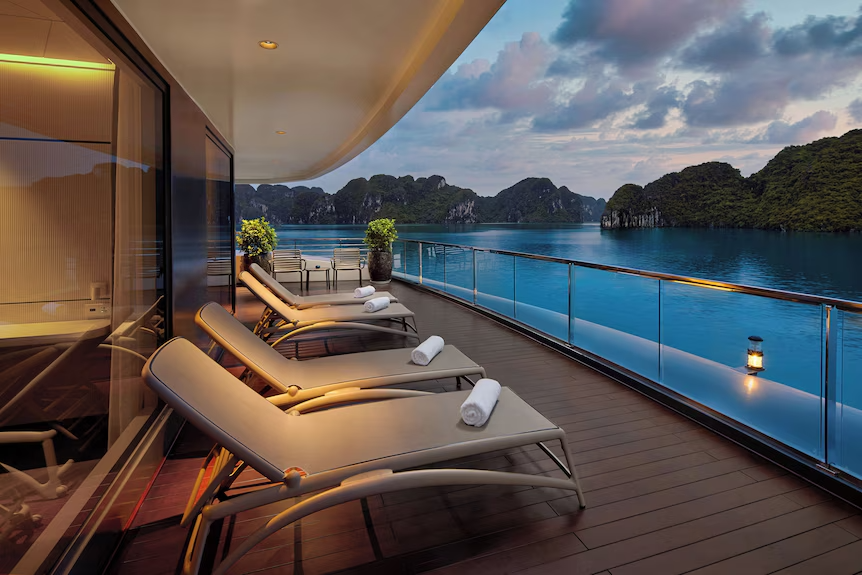 A cruise through Ha Long Bay is one of the best ways to relax among its stunning limestone islands. Luxury cruises offer spacious cabins, private balconies, fine dining, and spa services, while budget options provide affordable sightseeing and social experiences. Most boats feature sundecks for sunrise tai chi, sunset drinks, and peaceful views, making Ha Long Bay ideal for rest and scenic escape.